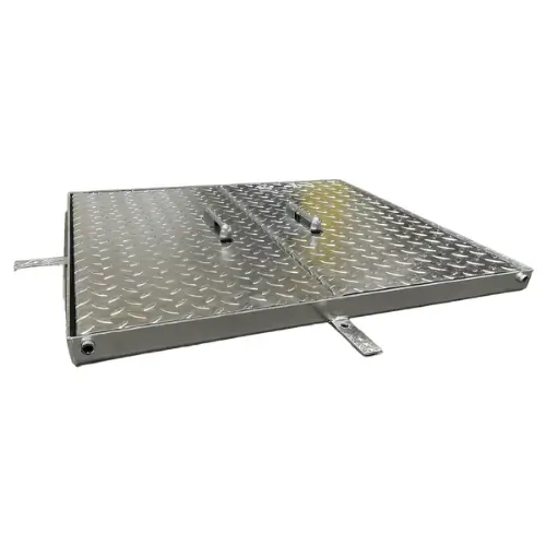 - Nos trappes d’accès sont constituées d’un cadre réalisé en cornières laminées 45 x 45 x 4.5 munies de pattes (pour scellement ou fixation par vissage, voir dernière photo) et de deux ouvrants sur paumelles réalisés en tôle larmée antidérapante épaisseur 3/5mm